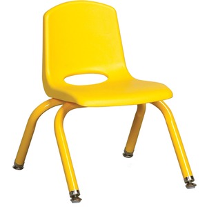 Perfect for any classroom space, these innovative, school stack chairs are built for comfort and durability. The 10" seat height is perfect for children ages 2 to 5 years old. Stack chair features a molded plastic seat with vented back for comfort, reinforced ribbing in back and under the seat for added strength, steel powder-coated legs, and steel lower back support. Leg color matches seat color. Chair legs are equipped with nylon swivel glides perfect for hard floors. Frame and screws do not penetrate through the seat surface.
