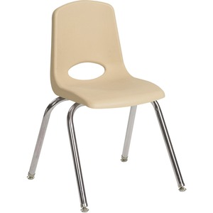 Perfect for any classroom space, this innovative, school stack chair is built for comfort and durability. The 10" seat height is perfect for children ages 2 to 5 years old. Stack chair features a molded plastic seat with vented back for comfort, reinforced ribbing in back and under the seat for added strength, and steel lower back support. Frame and screws do not penetrate through the seat surface. Chrome chair legs are equipped with nylon swivel glides perfect for hard floors.