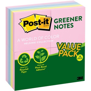 Greener Post-it Notes in a Value Pack help support a better future by using recycled paper and plant-based adhesive. Self-stick removable notes stick securely and remove cleanly. The 3" x 3" size is perfect for reminders or a short to-do list. The Helsinki color collection is airy and clean, honoring the simple pleasures of Scandinavian living. All Greener Post-it Notes are recyclable, and the paper in Post-it Notes is sourced from certified, renewable and responsibly managed forests.