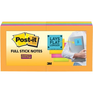 Post-it Super Sticky Full Adhesive Notes provide versatility and reliability for new uses in new places. Notes hold longer and stronger yet remove cleanly. Use inside planners, ring binders, calendars and journals so you always have notes handy. Full adhesion across the entire back of each note makes sure the whole pad stays together when it is stuck to a surface. Nonstick edge has rounded corners for fast, easy removal from pad. Individual notes are ideal to leave a note on almost any vertical surface. Each pad contains 25 sheets.
