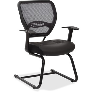 Guest chair features an Eco Leather Seat and breathable Air Grid back for a professional look. The seat is thickly padded and contoured. Breathable back offers built-in lumbar support. Design also includes a fixed angled T-arms and heavy-duty sled base with a black finish. Seat size is 20-1/2" wide x 19-1/2" deep x 3" thick. Back size is 20-1/2" wide x 18-1/2" high. Distance between arms is 18-3/4". Professional Air Grid Back Visitors Chair is also Greenguard Certified.
