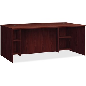 Breakfront Bow Desk Shell is part of the basyx by HON BL Laminate Furniture Collection that delivers a professional look on a budget. Tough, affordable and practical, this collection simply makes sense, helping you get the job done without a lot of bother. Modular components support popular, U-shaped and L-shaped layouts. Breakfront design with a bow top offers more legroom for visitor meetings and conferencing. Durable, 1" thick top is covered with abrasion-resistant, stain-resistant, thermal-fused Mahogany laminate. Modesty panel is full-height for maximum privacy. Desk shell also features two black grommets in the top for easy cord management. Adjustable floor-leveling glides provide 1/2" of adjustment. 27-3/4" high pedestals with unfinished tops slide inside this desk shell and are sold separately.