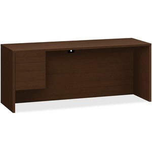 Credenza with 3/4 pedestal is a part of HON 10500 Series Wood Laminate Furniture that complements many furniture designs. Left-pedestal credenza features one box and one file drawer. Locking drawers offer five-sided construction for easy drawer alignment. Interchangeable, core-removable lock makes rekeying quick and easy. Box drawer operates on ball-bearing suspension with 3/4 extension while the file drawer extends fully on ball-bearing suspensions. Included hangrails are designed for side-to-side letter-size or legal-size filing and front-to-back letter-size filing. Top and end panels are made with durable, thermal-fused laminate over durable, 1-1/8" thick, solid-core high-performance particleboard and resist warping, scratches and stains. One-cord, pass-through, 3" grommet in the top center of the formal, full-height modesty panel is designed to reach electrical wall outlets while routing wires and cables. Credenza is not designed to be used with modular or mobile pedestals.