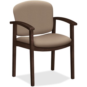 Contemporary wood guest chair features a molded polymer seat shell for added comfort and durability. Design also includes a four-leg base and single-rail arms with wide tops. Arms and legs are made of hardwood with a Mocha finish. Contoured backrest is fully upholstered. Floating back construction allows easy cleaning so this chair is excellent for healthcare environments. Seat measures 20" wide x 17" deep x 18-1/2" high from the floor. Distance between arms is 18-7/8". Usable seat depth is 17". Back measures 21" wide x 16" high from seat. Chair meets or exceeds ANSI/BIFMA and ISTA performance standards.