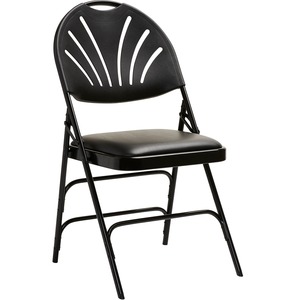 Vinyl seat folding chair is made with 18-gauge, steel tubes and double hinges to safely support up to 400 lb. Fanback-shaped back allows air to flow freely to help keep you cool during extended seating periods. Large seat size provides a more comfortable seating experience. Triple U-shaped braces create a high level of lateral strength for increased safety. Powder coating helps prevent scratches and wear to keep its elegant appearance for longer. Plus, its lightweight design and convenient hand hold allow easy transportation and setup.