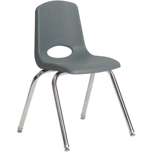 Innovative, school stack chair is built for comfort and durability. The 18" seat height is perfect for users who are ages 12 years old and up. Leg and seat angles are designed for better fit and comfort for adults, adding a slight tilt-back to the seat. Stack chair features a molded plastic seat with vented back for comfort, reinforced ribbing in back and under the seat for added strength, and steel lower back support. Frame and screws do not penetrate through the seat surface. Chrome chair legs are equipped with nylon swivel glides perfect for hard floors.