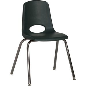 Innovative, school stack chair is built for comfort and durability. The 18" seat height is perfect for users who are ages 12 years old and up. Leg and seat angles are designed for better fit and comfort for adults, adding a slight tilt-back to the seat. Stack chair features a molded plastic seat with vented back for comfort, reinforced ribbing in back and under the seat for added strength, and steel lower back support. Frame and screws do not penetrate through the seat surface. Chrome chair legs are equipped with nylon swivel glides perfect for hard floors.