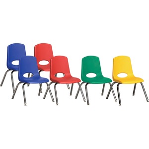 Perfect for any classroom space, the innovative, school stack chair is built for comfort and durability. The 12" seat height is perfect for children ages 3 to 7 years old. Stack chair features a molded plastic seat with vented back for comfort, reinforced ribbing in back and under the seat for added strength, and steel lower back support. Frame and screws do not penetrate through the seat surface. Chrome chair legs are equipped with nylon swivel glides perfect for hard floors.
