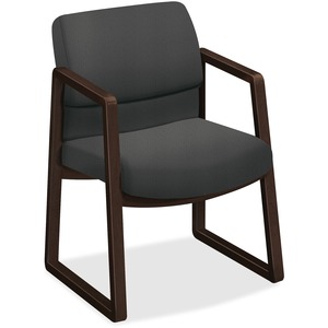 Sled-base guest chair offers solid construction for lasting performance and a fully upholstered outer back. Special lower lumbar area provides proper support for a natural sitting position. The 20" wide x 20" deep x 18-1/2" high seat is made with 1/2" thick, five-ply curved plywood and a 3-1/2" urethane foam cushion. Back measures 19-3/4" wide x 16" high from seat. Distance between arms is 19-1/2". Design also offers select hardwood square arms, frame and base caps. Chair is certified by SCS to be in compliance with specific, indoor, air-quality emission requirements and meets or exceeds applicable ANSI/BIFMA standards.