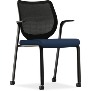 Multipurpose stacking chair delivers comfort from the inside out as a part of the HON Nucleus Series Seating. Inside the Nucleus seat, iliria-stretch NRAM material is pulled over a frame, and then over-molded with foam. This unique construction distributes weight evenly across the seat and eliminates pressure points for improved circulation and reduced muscle fatigue, delivering immediate, supportive comfort without the need for bulky padding. Once upholstered, this ultra-slim seat provides a soft initial cush and lasting, supportive comfort. Slender, contemporary look coordinates well with most open-plan systems. Four-leg base with casters provides sturdy support. Design also includes fixed arms and a breathable mesh back. Seat measures 19" wide x 19" deep while the back is 18" wide x 18-1/2" deep. Distance between the arms is 21-1/2". Usable seat depth is 18-1/2". Seat to floor height is 18-1/2". Chair holds up to 300 lb. and stacks up to four high.