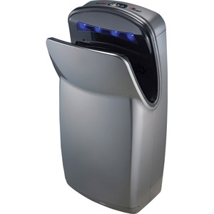 Vertical-style hand dryer features a 25 percent wider opening to prevent you from touching the sides for clean, sanitary use. A HEPA filter with an odor-neutralizing tablet reduces contaminates in the air and SteriTouch antimicrobial technology inhibits the growth of bacteria, mold and fungus to maintain a hygienic restroom environment. Dedicated water collection reservoir prevents water from collecting on the floor to maintain a safe environment. LED display conveniently indicates when you need to empty the water tray and change the HEPA filter for simple maintenance. Quiet operation prevents noisy distractions in sound-sensitive areas. Plus, its vertical construction is three times faster than traditional hand dryers to quickly dry hands in just 10 to 12 seconds.