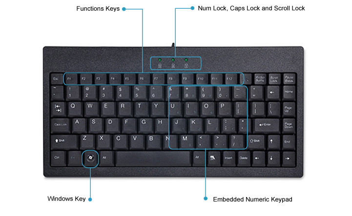 The mini size keyboard is designed with 87 keys, and is equipped with an embedded numeric keypad, featuring a Num Lock, Scroll Lock and Caps Lock LED display.