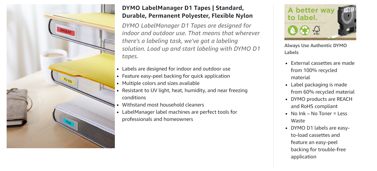 Perfect for heavy-duty jobs, DYMO D1 Durable Label Tapes feature professional-grade adhesive and resists fading, peeling, and decay from moisture, high heat, freezing temperatures, and household cleaners. Four color combinations available: