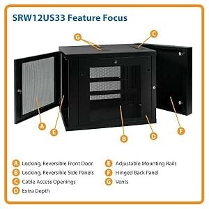 The wall bracket includes a sturdy hinge that allows the SRW12US33 to swing away from the wall for convenient access to equipment and cabling. The swing direction of the enclosure and door can be reversed by rotating the enclosure 180 degrees before installation. The wall bracket locks to provide secure access. The front door locks to provide secure access and is perforated to promote efficient airflow.