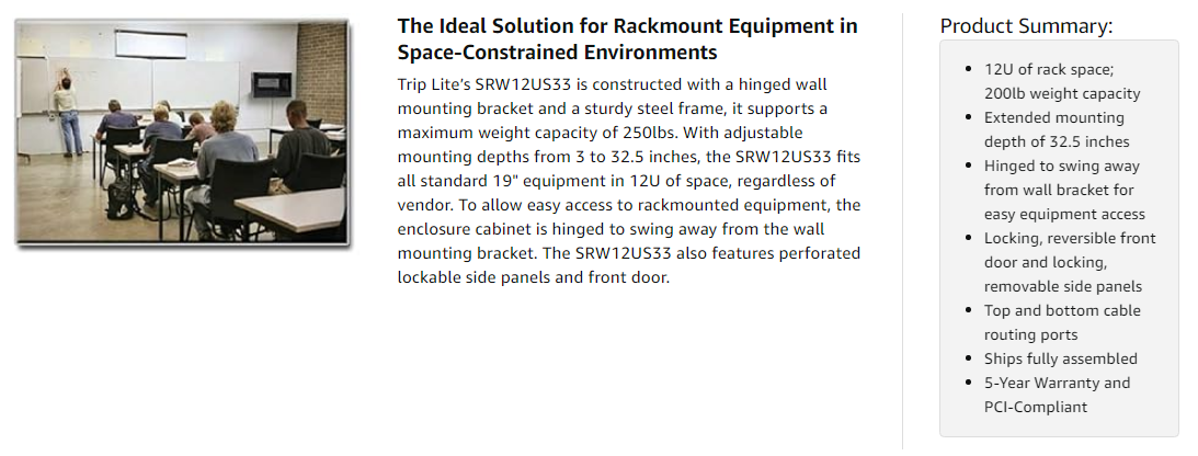 The SRW12US33 comes with a 5-Year Warranty and meets all enclosure requirements towards PCI DSS (Payment Card Industry Data Security Standard) compliance.