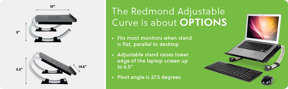 The Redmond Adjustable Laptop Stand can help you set your laptop screen at same height as your external monitor! Simply place your laptop on the Redmond Curve Stand and adjust the angle until your laptop screen is eye level with your external monitor. This innovative multi-use stand also features a ‘flat’ position which allows it to be used as a monitor stand! Simply adjust the stand until the surface is flat and level.