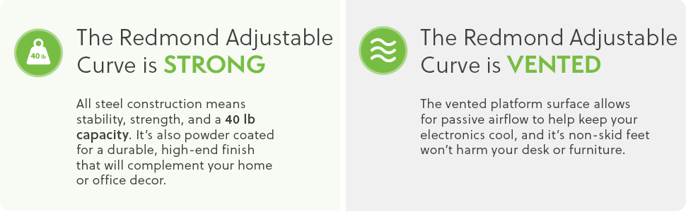 Allsop monitor stands are constructed from steel and covered with a durable powder-coat finish. The Redmond Curve’s molded non-skid feet are flexible and fully support the stand’s adjustment arms for excellent stability.