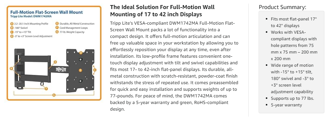 The DWM1742MA’s durable, all-metal frame supports displays weighing up to 77-pound and withstands the stress of repeated adjustments and use in common areas. Its scratch-resistant powder-coat finish tolerates frequent handling.