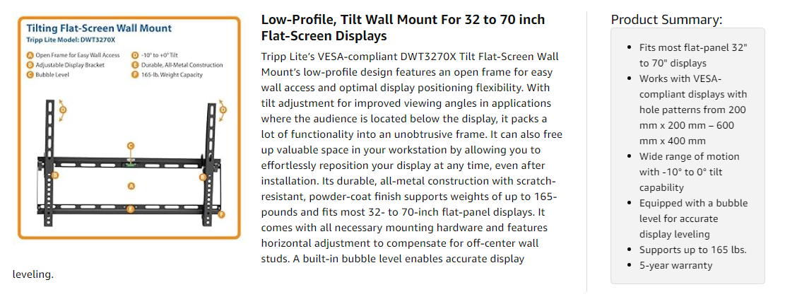 The DWT3270X adjusts to optimize viewing angles and makes the most of your display environment. It upgrades existing displays with a -10° to 0° tilt range to minimize glare, provide comfortable viewing angles and reduce fatigue. This makes it ideal for a wide range of home and business applications like airport informational displays, hotel conference rooms, point-of-sale displays, security stations, home theaters and any display application that requires angled viewing.