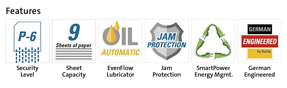 The Dahle 40430 Office Shredder supports the highly sensitive document shredding needs of busy offices with 3-5 users. It features an EvenFlow automatic lubricator, SmartPower energy management, and built-in clog protection to eliminate frustration. This P-6 shredder produces 1/32 "x 7/16" particle size and holds up to 30 gallons of shredded waste. It is designed in Germany and guaranteed to provide many years of trouble-free operation.