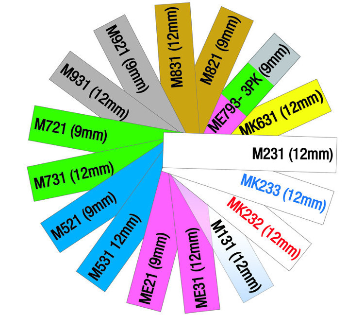 Genuine Brother 'M' tapes comes in 9 millimeter (~3/8 inch) and 12 millimeter (~ ½ inchs) widths and a range of colors.