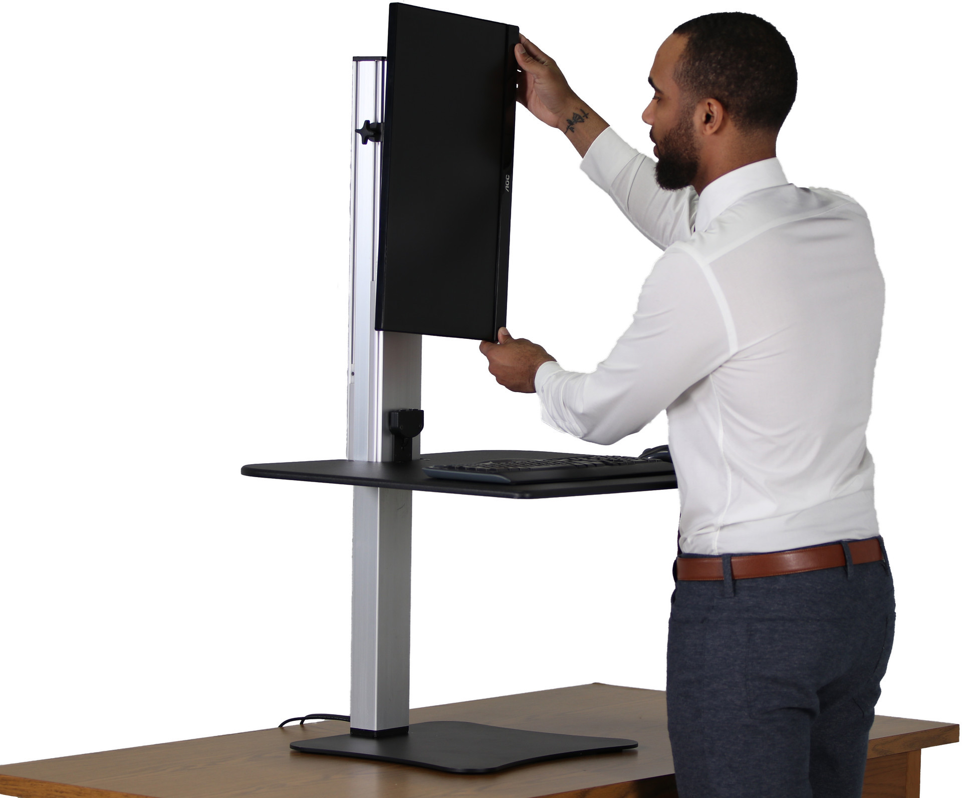 Steel base has felt pads underneath to protect desk/table surface. This standing desk converter rests on top of any desk or table. With no clamping or attachments of any kind to tie you down, the workstation is easily repositioned. Dimensions: 28”W X 23”L X 1 to 20”H and 39.5lbs. Holds one monitor of any size up to 25 pounds. Standard VESA mounting holes are required.