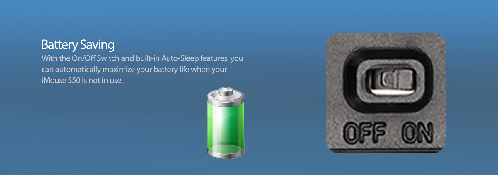 Battery Saving With the On/Off Switch and built-in Auto-Sleep features, you can automatically maximize your battery life when your iMouse S50 is not in use.