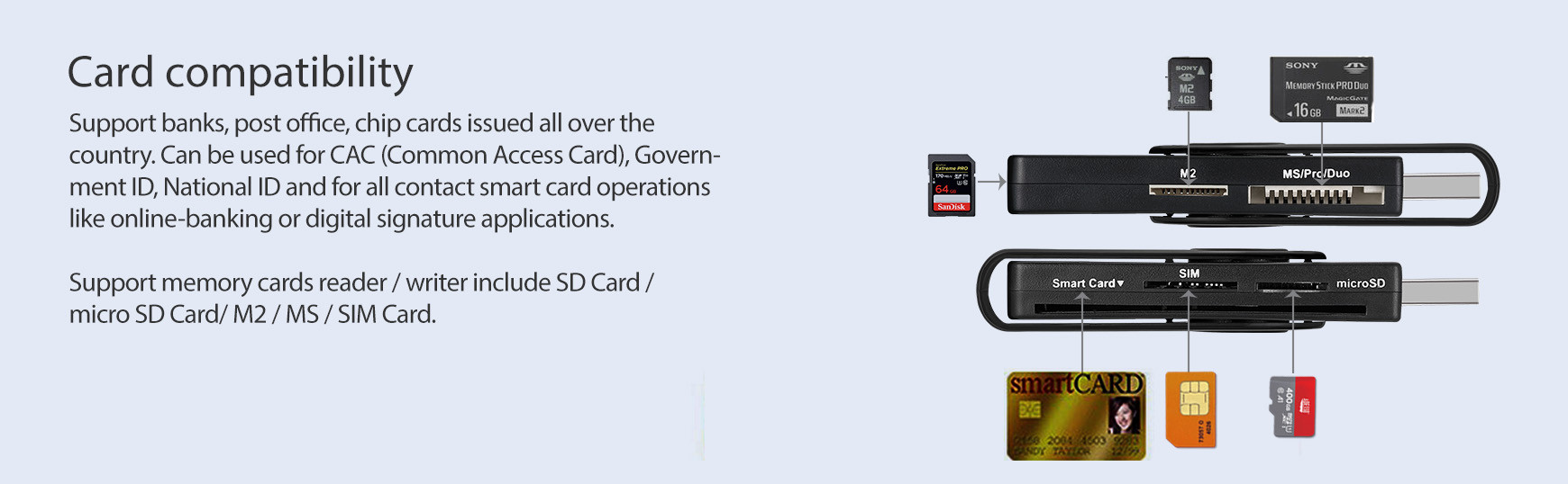 Support banks, post office, chip cards issued all over the country. Can be used for CAC (Common Access Card), Government ID, National ID For all contact smart card operations like online-banking or digital signature applications: ActivClient, AKO, OWA, DKO, JKO, NKO, BOL, GKO, Marinenet, AF Portal, Pure Edge Viewer, ApproveIt, DCO, DTS, LPS, Disa Enterprise Email etc.