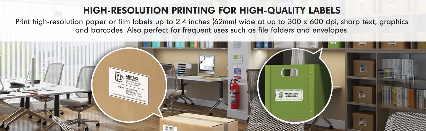 Tackle big labeling jobs in a short amount of time with print speeds up to 44 labels per minute.(2) Quickly create cost-effective paper and film labels for packages, envelopes, file folders and more.