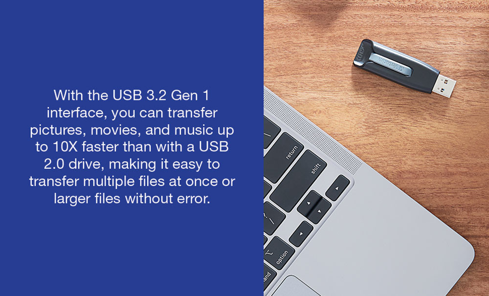 Transfer pictures, movies, and music up to 10X faster than with a USB 2.0 drive, making it easy to transfer multiple files at once or larger files without error.