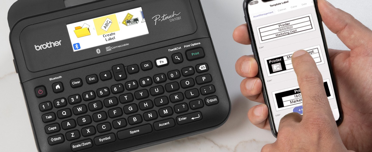 Quickly create and print labels using the built-in keyboard. For additional functionality, connect to Android™ and iOS® devices via Bluetooth, or use the intuitive P-touch Editor Software¹ on a PC or Mac® computer via USB or Bluetooth