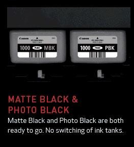 On other printers, switching from Matte Black to Photo Black consumes a significant amount of ink and time. The imagePROGRAF PRO-1000 is designed to work seamlessly when changing media types. Matte Black and Photo Black inks have their own dedicated nozzles, so no switching is necessary. You can print on fine art paper then glossy paper with no worries, no changes, and no waste.