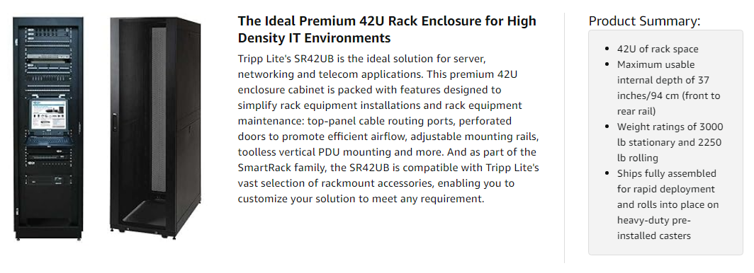 The SR42UB is optimized for datacenter and other high-density IT applications. Its massive front-to rear-ventilation capacity meets or exceeds server manufacturer requirements. It features integrated baying tabs that make it easy to combine multiple enclosures in rows for datacenter applications. The SR42UB is also 100% compatible with today's state-of-the-art hot-aisle/cold-aisle datacenter configurations.