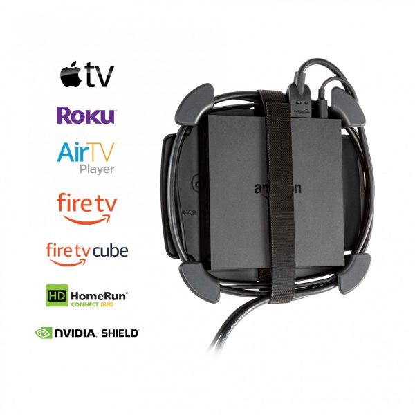 Store streaming devices and organize your cables and wires with the Wrap Caddy. The Wrap Caddy can accommodate a variety of streaming devices with its adjustable fit strap and the integrated cable management tabs control extra cable and prevent pinching.
