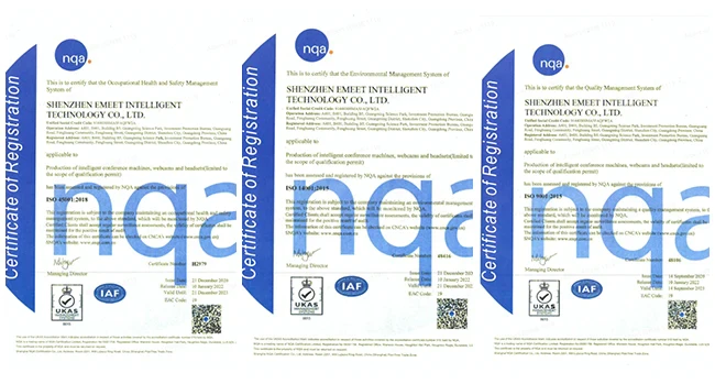 EMEET has its own full-automatic manufacturing workshop with dozens of production lines, producing 300,000+ units per year at maximum production capacity. 100% of products will be scrupulously tested before delivery, some of which enjoy a 2-year warranty. At the same time, EMEET has received ISO9001, ISO14001, and ISO45001 quality management system certifications.
