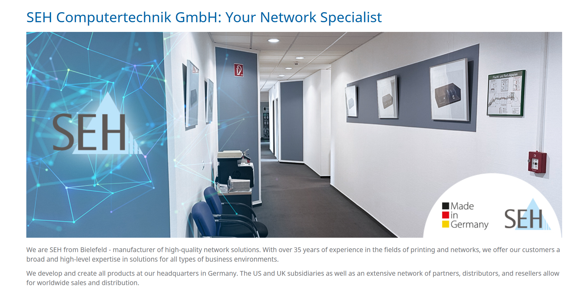 SEH Computertechnik is an innovator for network solutions, primarily in the licensed software/USB management and printing sectors. Founded in 1986 as a custom software and technology company, SEH has evolved to offer professional and secure network solutions for all types of businesses across a variety of industries. SEH adapts its technologies to create unique, highly integrated solutions with exceptional price/performance ratios.