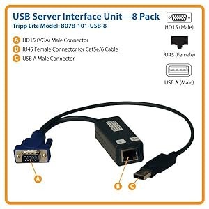 With the B078-101-USB-8, there is no software or external power needed. Plug the USB and HD15 connectors into the server to be controlled, run the Cat5e/6 cabling to your KVM, and you’re ready to go. The unit connects a server or computer with an HD15 connector for video and USB-type connectors for mouse and keyboard control to a KVM switch with Cat5e/6 (RJ45) connectors.