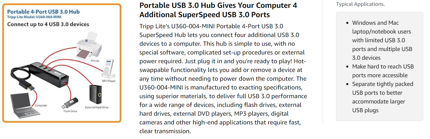 The U360-004-MINI provides plug-and-play convenience, with no special software or complicated setup procedures required. The U360-004-MINI also features hot-swappable functionality, allowing you to add or remove a device at any time with no need to power down the computer. The U360-004-MINI is bus-powered via the computer's USB port, and for most applications no external power is required (external hard drives needing a power supply will still need to be powered independently of the hub).