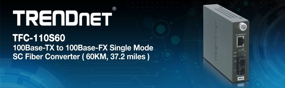 The TFC-110S60 Fiber Converter works with the TFC-1600 chassis system or as a standalone unit. This converter is a Single Mode SC-Type fiber converter spanning distances up to 60km (37.2 Miles). Ports include 1 x 10/100Base-TX (RJ-45) port and 1 x 100Base-FX fiber port (SC-Type).