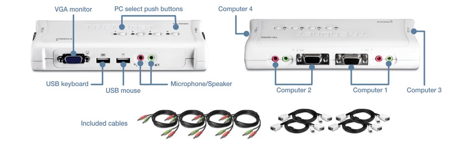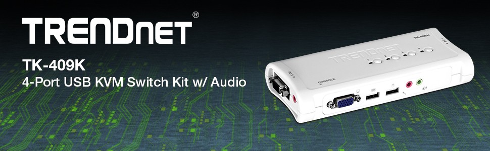 The 4-Port USB KVM Switch with Audio lets you manage 4 computers with just one set of keyboard, monitor, mouse, and a set of speakers / microphone. The device comes with 4 sets of USB KVM and audio cables, no additional equipment required. Its compact size makes it ideal for home and business environment.