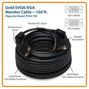This 100 ft. molded cable features premium foil and braid shielding, as well as mini-coax (RGB) and paired video wire construction, to deliver top-of-the-line signal quality and protection from EMI/RFI interference. Gold-plated HD15 male connectors with gold-plated copper contacts ensure excellent conductivity. Integral strain relief ensures the cable and connectors last a long time.