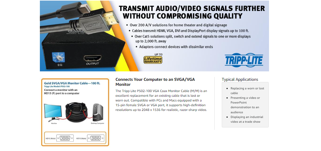 The P502-100 comes with a lifetime warranty. It’s manufactured in compliance with strict RoHS specifications, reflecting Tripp Lite’s commitment to environmental responsibility.