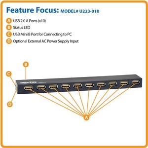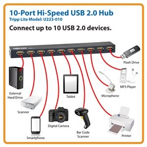 Never run short of open USB ports. With this 10-port hub, you’ll be able to connect all of your USB 1.1 and 2.0 devices. The U223-010 is completely plug-and-play: it requires no external power, software or complicated set-up procedures. Plus, it’s hot-swappable, so you can add or remove a device at any time without shutting down.