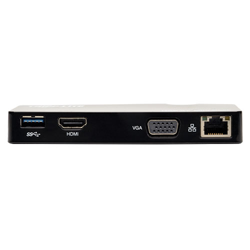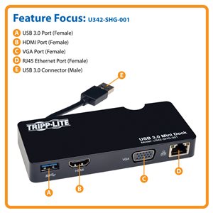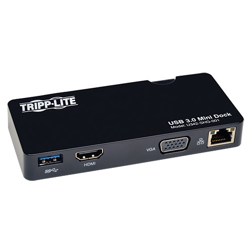 Tripp Lite’s U342-SHG-001 USB 3.0 SuperSpeed Mini Docking Station allows you to connect and manage multiple devices from just one USB 3.0 port. Independent HDMI and VGA monitor outputs can be used separately to expand or mirror your computer’s main desktop. A USB 3.0 port connects and charges peripheral devices, such as smartphones, thumb drives, DVD players, digital cameras, MP3 players and external hard drives. And an RJ45 Ethernet port connects you to a 10/100/1000 Mbps network without having to install an internal Ethernet card in your computer.