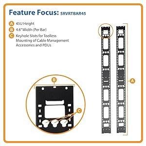 SRVRTBAR45 cable management bars are compatible with 45U enclosure cabinets. For fast installations, keyhole slots allow for easy device installation with devices equipped with toolless mounting buttons. Tripp Lite offers an extensive selection of toolless-mountable Basic, Metered, Monitored and Switched 0U PDUs and SR-series enclosure cabinet accessories.
