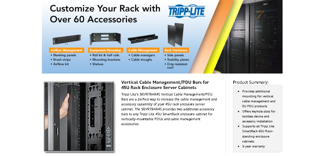 The SRVRTBAR45 comes with a 5-year warranty. As part of Tripp Lite’s commitment to environmental responsibility, it is manufactured in compliance with strict RoHS specifications.