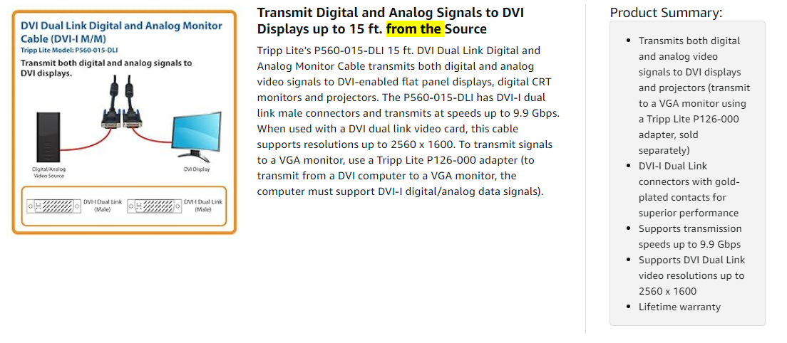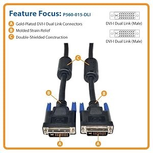The P560-015-DLI is manufactured using top-quality materials. It has gold-plated copper contacts to ensure excellent conductivity. Double shielding with foil and braid and dual ferrite chokes provide maximum EMI/RFI protection and superior signal quality. The P560-015-DLI also has strain relief for durability and long life.