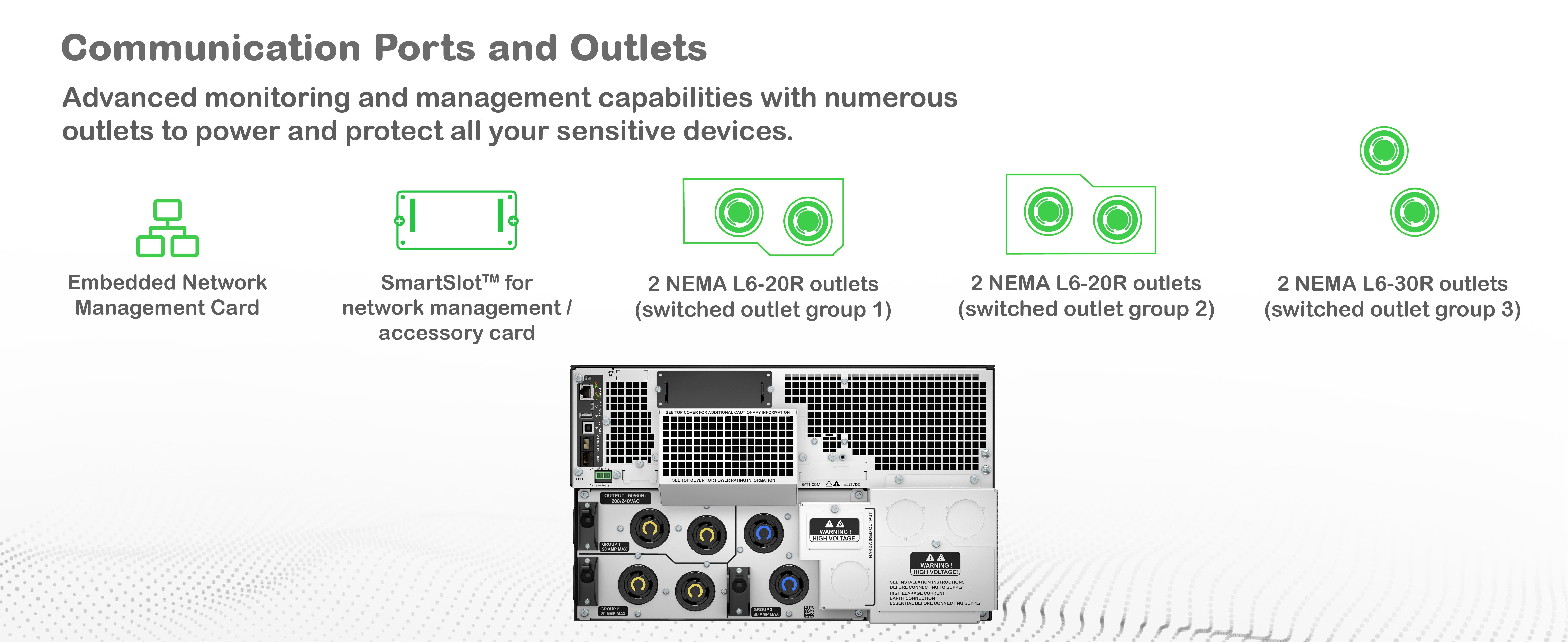 (2) NEMA L6-30R and (4) NEMA L6-20R outlets, including 3 switched outlet groups