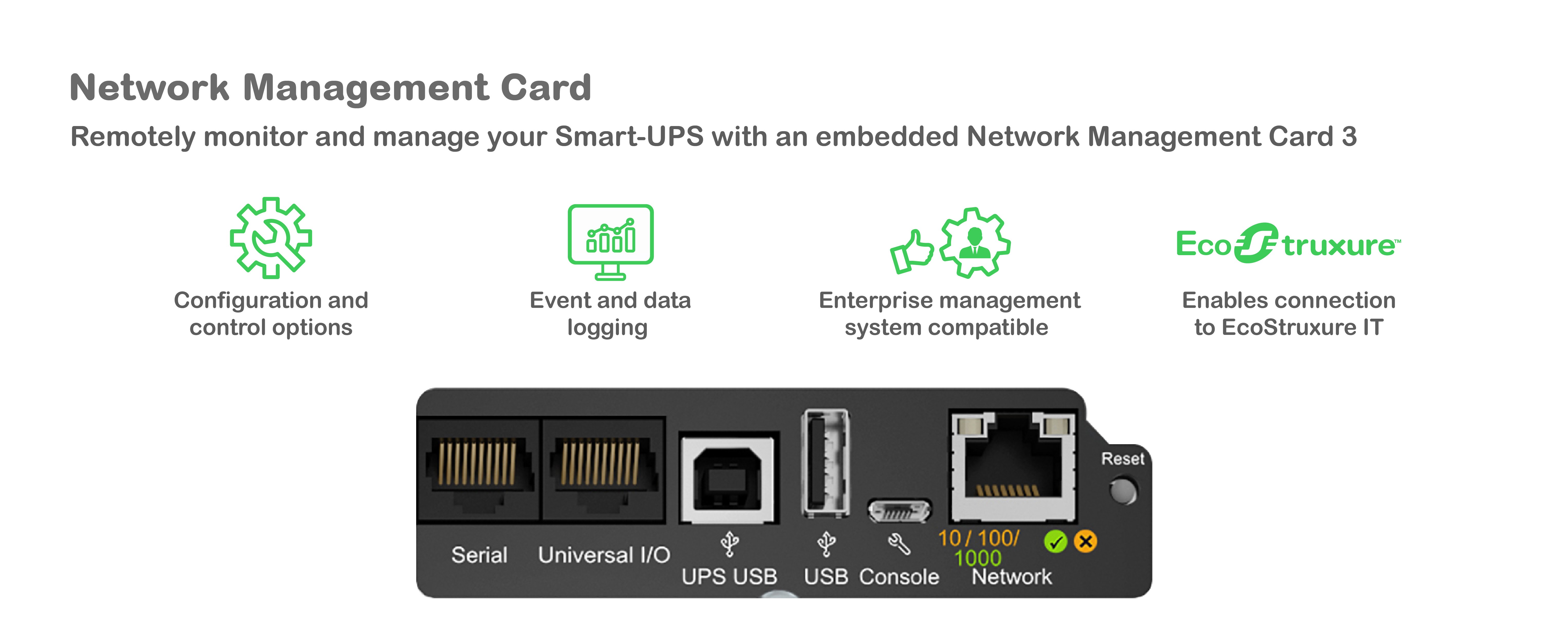 Options for monitoring and managing your UPS include EcoStruxure IT, Network Management Card, and PowerChute™ Network Shutdown Software.