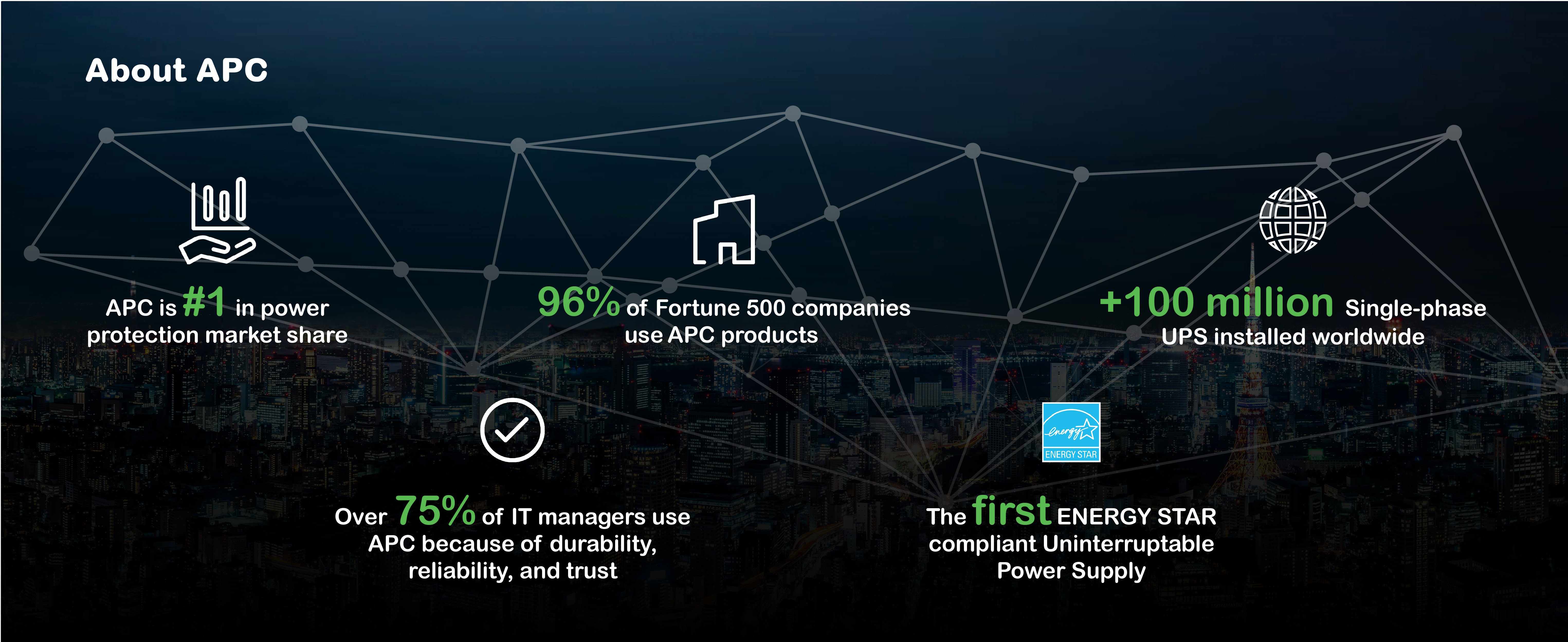 APC, a flagship brand of Schneider Electric, provides clean battery backup power, surge protection, and IT physical infrastructure inside and outside the traditional IT environment. Through our APC brand products and solutions, we offer certainty in a connected world. Certainty that our reliable, integrated physical infrastructure solutions are based on the fundamental premise that your data and information should — and always will be — accessible.